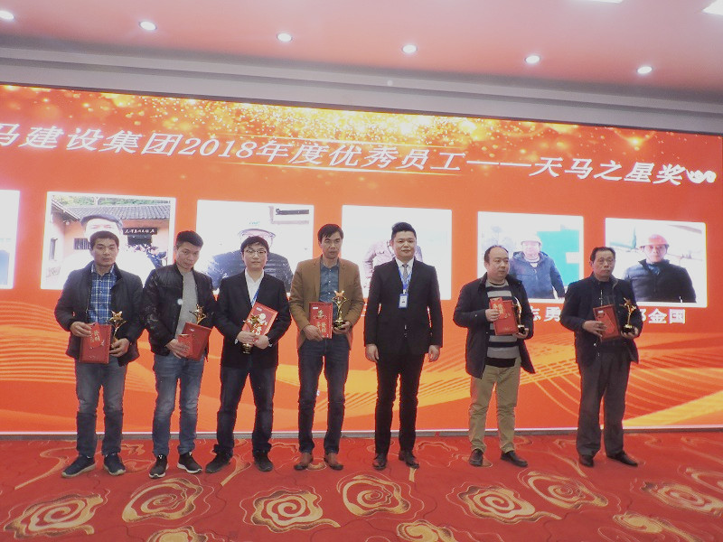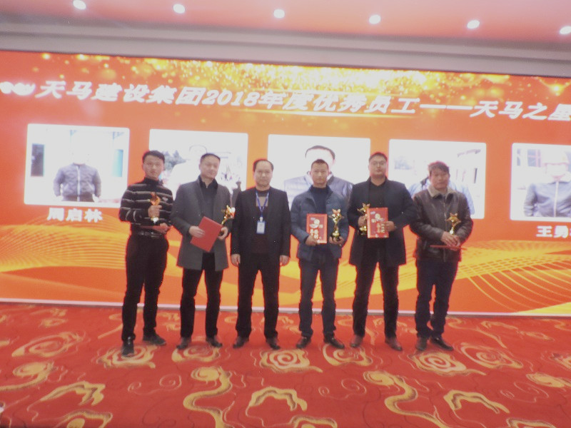 2018年度優(yōu)秀員工——天馬之星獎”:“中石化項目” 施工員 劉 毅;“軍運會立面整治”項目經(jīng)理 羅建剛;“嘉魚高地項目” 技術(shù)負(fù)責(zé)人 陳 新;“利川觀瀾國際 項目副經(jīng)理 劉國舫;“襄陽項目” 項目經(jīng)理 王安順