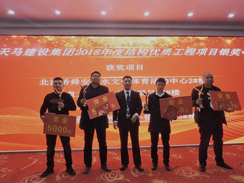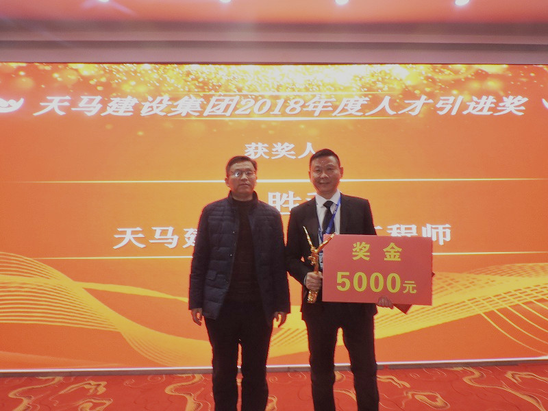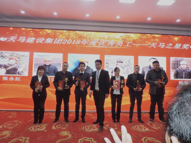 2018年度優(yōu)秀員工——天馬之星獎”:“重慶黔江項目”棟號長 周啟林;“新疆九州通項目” 執(zhí)行經(jīng)理 胡小洲;“天門農(nóng)商城項目” 技術(shù)負(fù)責(zé)人 王良沖;“天地源工業(yè)廠房” 現(xiàn)場負(fù)責(zé)人 葛曉光;“美聯(lián)·奧園”項目 安全員 王勇林;頒獎人:集團公司綜合辦主任胡海華