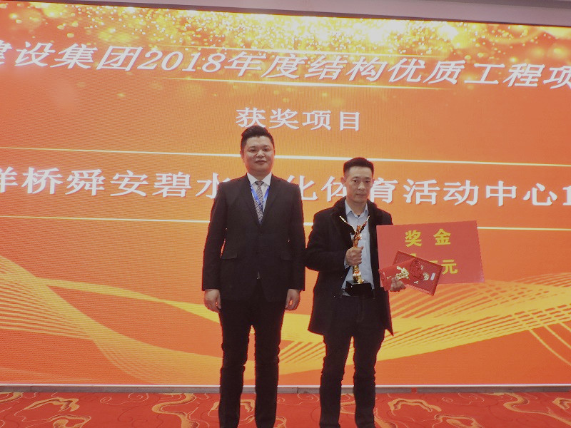 “2018年度/結(jié)構(gòu)優(yōu)質(zhì)工程/項目金獎”:“北洋橋舜安碧水文化體育活動中心1#樓”;頒獎人:集團公司執(zhí)行總經(jīng)理蔡建華