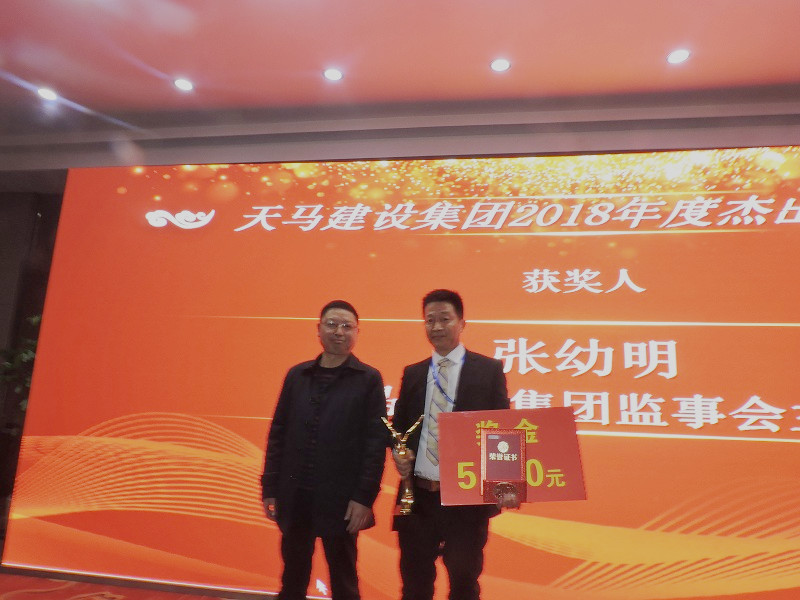 2018年度優(yōu)秀員工——天馬之星獎”:“天馬建設(shè)集團”綜合部 張永紅;“經(jīng)開7#地塊” 施工員 操國文;“經(jīng)開9#地塊” 施工員 王 成;“天馬建設(shè)集團” 財務(wù)部 何 歡;“武漢光谷電信項目” 生產(chǎn)經(jīng)理 靖雙紅;“五里界恒大項目”棟號長 楊放;頒獎人:集團公司監(jiān)事會主席張幼明