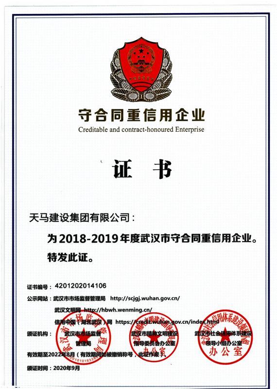 近日,湖北省及武漢市市場監(jiān)督管理局相繼公布了2018-2019年度守合同重信用企業(yè)名單。天馬建設(shè)再次被認(rèn)定為省、市2018-2019年度“守合同重信用”企業(yè)。